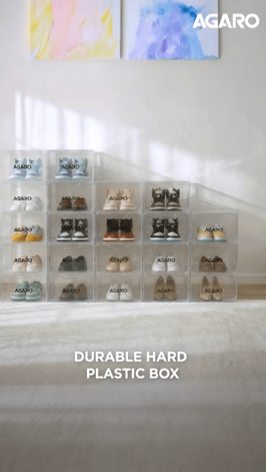 - STURDY & STACKABLE SHOE CRATES: Made of heavy-duty plastic which is hard, thick, sturdy, and non-deformable. The shoe boxes can be stacked and connected together to prevent them from falling out when tilted. The shoe box can be combined freely according to the storage space. Such as entryway,under the bed,closet,toilet,etc