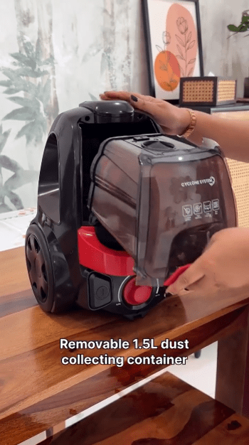 - The 1.5 litres bagless bin is designed for hygienic removing and emptying with one hand, which helps minimize dust clouds